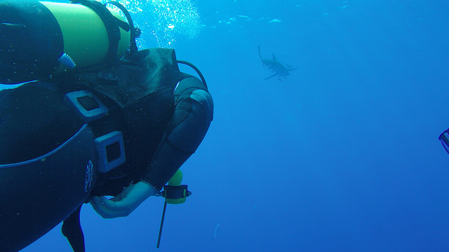 On se met à l’eau les premiers, comme prévu, en sautant depuis l’arrière du bateau. Mais une fois dans l’eau, on se rends compte qu’il y a trois requins longimanes qui nous tournent autour ! Fantastique ! On crie à tout le monde de venir vite, tout en se pressant pour sortir nos appareils photos. Pendant 10 minutes, les requins passeront entre nous, de beaux longimanes avec leurs poissons pilotes. Tout le monde est vraiment très content, les requins ont fait plusieurs passages assez lents, bien calmes, et surtout à faible profondeur ce qui a permis d’avoir de vraiment belles vidéos.
