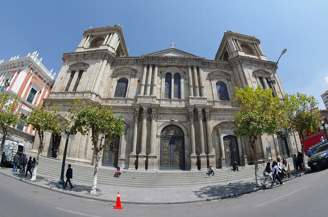 On se fait déposer en bas de la rue Sagarnaga, puis on marche quelques dizaines de mètres jusqu’à la place San Francisco, sur laquelle se trouve l’église San Francisco.